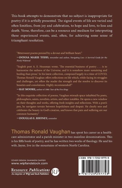 This book attempts to demonstrate that no subject is inappropriate for poetry if it is artfully presented. The signal events of life are varied and often limitless, from joy and celebration, to hope and love, to loss and death. Verse, therefore, can be a resource and medium for interpreting these experienced events, and, often, for achieving some sense of triumphant resolution.