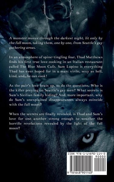 A monster moves through the darkest night, lit only by the full moon, taking them, one by one, from Seattle's gay gathering areas. In an atmosphere of spine-tingling fear, Thad Matthews finds his first true love cooking in an Italian restaurant called The Blue Moon Cafe. Sam Lupino is everything Thad has ever hoped for in a man: virile, sexy as hell, kind, and...he can cook! As the pair's love heats up, so do the questions. Who is the killer preying on Seattle's gay men? What secrets is Sam's Sicilian family hiding? And, more important, why do Sam's unexplained disappearances always coincide with the full moon? When the secrets are finally revealed, is Thad and Sam's love for one another strong enough to weather the horrific revelations revealed by the light of the full moon?