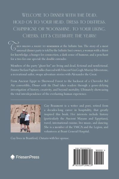 Welcome to Dinner with the Dead, hold on to your head. Dress to distress. Champagne or moonshine, to your liking. Cheers, let's celebrate the years! Thus begins a night to remember at the Infinite Inn. The story of a most unusual dinner party is told by the Infinite Inn's owner, a woman with a thirst for knowledge, a hunger for connection, a dark sense of humour, and a penchant for a two-for-one special: the double entendre. Invitees to the party "ghost list" are living and dead, fictional and nonfictional. Painter Stefani Pagliaro talks charcoal with Vincent Van Gogh. Murray Silverstone, a recreational sailor, swaps adventure stories with Alexander the Great. From Ancient Egypt to Sherwood Forest to the backseat of a Chevrolet Bel Air convertible, Dinner with the Dead takes readers through a genre-defying investigation of history, creativity, and beyond mortality. Ultimately showcasing the vital interdependence of the everlasting human experience.