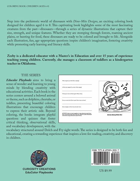 Step back in time with Dino-Mite Designs, a thrilling coloring book designed for children aged 6 to 8, where dinosaurs, the giants of the prehistoric world, come to life. Each page is filled with dynamic and detailed illustrations of various dinosaurs in their ancient habitats. From the mighty Tyrannosaurus Rex to the gentle Brontosaurus, these pages allow young explorers to immerse themselves in the fascinating world of dinosaurs, adding their own splash of color to these long-extinct creatures. But Dino-Mite Designs is more than just a coloring book. Accompanying every picture is a series of age-appropriate questions which utilize the frameworks of both Dolch and Fry sight words (additional age-appropriate words may also be used). This further engages the young artists with playful questions related to the coloring picture. Questions like, "What color do you think the bear's hat should be?" or "How many spots can you add to the upside-down bird?" not only inspire creativity in coloring but also promote critical thinking, observation, and writing skills. Dino-Mite Designs: The Dinosaur Coloring & Quiz Book is an ideal pick for any child fascinated by the mysterious and thrilling world of dinosaurs. It skillfully combines the fun of coloring with storytelling and interactive quizzes, making it a great resource for both entertainment and education. This book is sure to become a treasured addition to any young paleontologist’s collection, providing hours of colorful, educational, and adventurous fun.