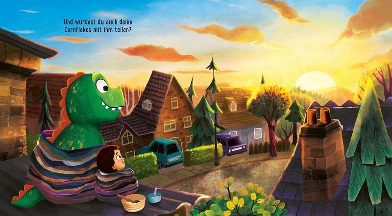 Ein witziges Buch, dass die Kinder direkt anspricht und sie vor einen Entscheidung stellt, auch wenn die Fragen im Buch immer mit Ja beantwortet werden. Fröhliche Bilder, die den Jungen und den Dino an den unterschiedlichsten Orten zeigen, machen Spaß anzuschauen.