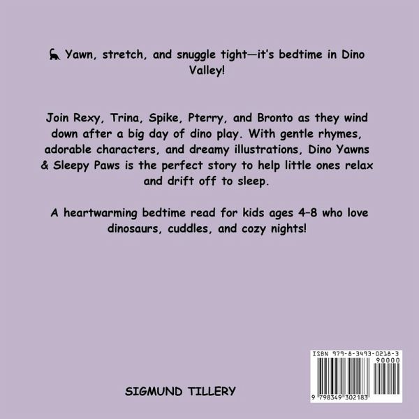 ���� Yawn, stretch, and snuggle tight-it's bedtime in Dino Valley! Join Rexy, Trina, Spike, Pterry, and Bronto as they wind down after a big day of dino play. With gentle rhymes, adorable characters, and dreamy illustrations, Dino Yawns & Sleepy Paws is the perfect story to help little ones relax and drift off to sleep. A heartwarming bedtime read for kids ages 4-8 who love dinosaurs, cuddles, and cozy nights!