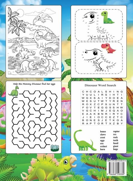 Fun Activity Book for Kids! Including Coloring, Dot to Dot Puzzles, Word Searches & Mazes! This dinosaur-themed workbook will help improving hand-eye coordination and developing motor skill. Let the fun begin! Carefully picked designs will provide hours of fun, stress relief, creativity, relaxation and stimulate your child's creativity and imagination. It makes a perfect gift! What you get in this book: ¿¿ Beautiful and unique designs, no repeats ¿¿ 8.5 x 11 inches format, large print ¿¿ Single sided pages to avoid bleed through ¿¿ Color the pages with a crayon, pen, marker and / or crayon of your choice. ¿¿ Fun Dinosaurs Activities - Mazes, Tracing, Word Search and More! ¿¿ Ideal as a gift Kws: dinosaur activity books, dinosaurs activity book, dinosaur tracing book, dinosaur colring book, dinosaur coloring books for kids 3-8, coloring books for kids dinosaur, coloring book dinosaur