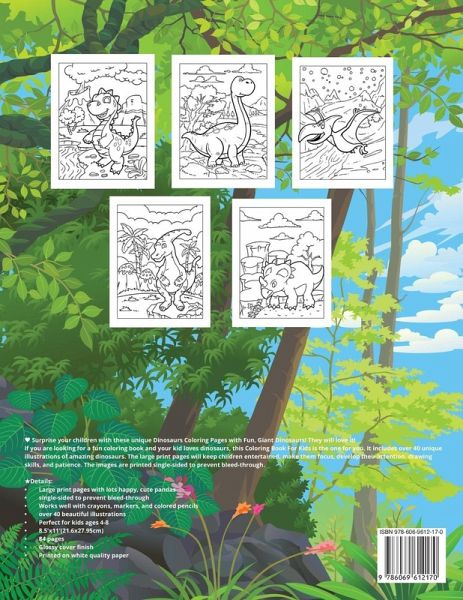 ¿ Surprise your children with these unique Dinosaurs Coloring Pages with Fun, Giant Dinosaurs! They will love it! If you are looking for a fun coloring book and your kid loves dinosaurs, this Coloring Book For Kids is the one for you. It includes over 40 unique illustrations of amazing dinosaurs. The large print pages will keep children entertained, make them focus, develop their attention, drawing skills, and patience. The images are printed single-sided to prevent bleed-through. Your kids will have fun and keep entertained, and they also may unknowingly acquire other benefits through coloring: ¿ improved motor skills ¿ improved focus ¿ improved hand to eye coordination ¿ stress relief ¿ creativity & self-expression ¿Details: ¿ Large print pages with lots happy, cute pandas ¿ Single-sided to prevent bleed-through ¿ Works well with crayons, markers, and colored pencils ¿ Over 40 beautiful illustrations ¿ Perfect for kids ages 4-8 ¿ 8.5'x11'(21.6x27.95cm) ¿ 84 pages ¿ Glossy cover finish ¿ Printed on white quality paper Let your child's imagination run wild! Get this Dinosaur Coloring Book for your kid today and make it an amazing gift!