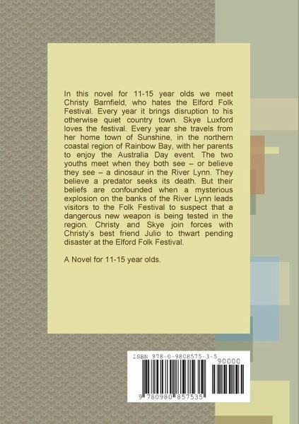 In this novel for 11-15 year olds we meet Christy Barnfield, who hates the Elford Folk Festival. Every year it brings disruption to his otherwise quiet country town. Skye Luxford loves the festival. Every year she travels from her home town of Sunshine, in the northern coastal region of Rainbow Bay, with her parents to enjoy the Australia Day event. The two youths meet when they both see - or believe they see - a dinosaur in the River Lynn. They believe a predator seeks its death. But their beliefs are confounded when a mysterious explosion on the banks of the River Lynn leads visitors to the Folk Festival to suspect that a dangerous new weapon is being tested in the region. Christy and Skye join forces with Christy's best friend Julio to thwart pending disaster at the Elford Folk Festival.