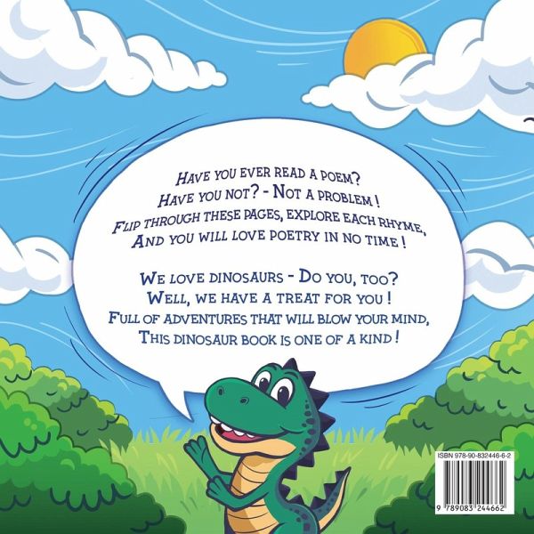 This book of poetry for children includes 15 playful, easy-to-read poems about the adventures of a group of friendly dinosaurs. Each poem is 8 lines long, has different protagonists, and includes a full-color illustration. This book will give you and your little ones a great excuse to spend quality time together, reading, looking at the illustrations, and discovering how magical words can be. The short poems are perfect for bedtime, playtime, and storytime at home or school. Children will learn to appreciate poetry and will realize using rhymes can bring so much fun! In short:15 playful 8-line poems 15 full-color, full-page illustrations Many awesome dinosaurs A "From - To" personalization page, which makes this book an ideal present! Also available in e-book format!