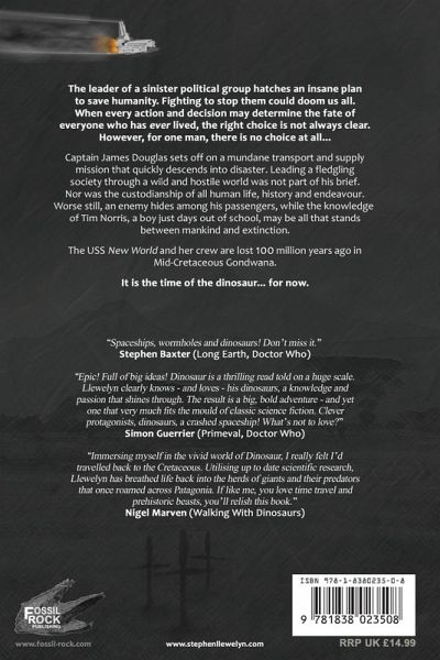 "Spaceships, wormholes and dinosaurs! Don't miss it." Stephen Baxter (Time, The Long Earth, Doctor Who) "Epic! Full of big ideas! Dinosaur is a thrilling read told on a huge scale. A massive spaceship packed full of characters is all set for a new life in space - but instead drops through a wormhole and ends up on prehistoric Earth. Stranded, struggling to survive, these people have a major problem to contend with: they're marooned on the planet of the dinosaurs! Stephen Llewelyn clearly knows - and loves - his dinosaurs, and that knowledge and passion shines through. The result is a big, bold adventure - and yet one that very much fits the mould of classic science-fiction, some very clever protagonists responding to a crisis by breaking it down into problems to be solved. Dinosaurs! Crashed spaceship! What's not to love?" Simon Guerrier (Primeval, Doctor Who, Sherlock Holmes, Buffy the Vampire Slayer) "Immersing myself in the vivid world of Dinosaur, I really felt I'd travelled back to the Cretaceous. Utilising up to date scientific research, author Stephen Llewelyn has breathed life back into the herds of giants and their predators that in the past, roamed across Patagonia. If like me, you love time travel and prehistoric beasts, you'll relish this book." Nigel Marven, TV Naturalist (Prehistoric Park, Walking With Dinosaurs) The leader of a sinister political group hatches an insane plan to save humanity. Fighting to stop them could doom us all. When every action and decision may determine the fate of everyone who has ever lived, the right choice is not always clear. However, for one man, there is no choice at all... Captain James Douglas sets off on a mundane transport and supply mission that quickly descends into disaster. Leading a fledgling society through a wild and hostile world was not part of his brief. Nor was the custodianship of all human life, history and endeavour. Worse still, an enemy hides among his passengers, while the knowledge of Tim Norris, a boy just days out of school, may be all that stands between mankind and extinction. The crew and passengers of the USS New World are lost 100 million years ago in Mid-Cretaceous Gondwana. It is the time of the dinosaur... for now. New World Series of Time Travel Historical and Prehistoric Fiction Adventure Books: Fast-paced science fiction adventure. If you enjoy gripping time travel novels set in the past, with a mixture of action and suspense, plenty of humour and twists - and yes, dinosau