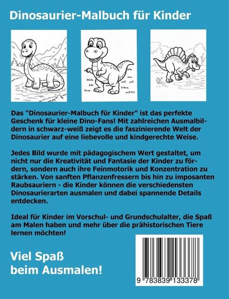 Das "Dinosaurier-Malbuch für Kinder" ist das perfekte Geschenk für kleine Dino-Fans! Mit zahlreichen Ausmalbildern in schwarz-weiß zeigt es die faszinierende Welt der Dinosaurier auf eine liebevolle und kindgerechte Weise. Jedes Bild wurde mit pädagogischem Wert gestaltet, um nicht nur die Kreativität und Fantasie der Kinder zu fördern, sondern auch ihre Feinmotorik und Konzentration zu stärken. Von sanften Pflanzenfressern bis hin zu imposanten Raubsauriern können die Kinder die verschiedensten Dinosaurierarten ausmalen und dabei spannende Details entdecken. Ideal für Kinder im Vorschul- und Grundschulalter, die Spaß am Malen haben und mehr über die prähistorischen Tiere lernen möchten! Empfohlen wird das Ausmalen mit Buntstiften, mit Wachsmalstiften oder Filzstiften. Ganz nach den Vorlieben ihres geliebten Kindes. Hinweis zur 2. Auflage: Diese überarbeitete 2. Auflage wurde erstellt, um die Qualität des Malbuchs weiter zu verbessern. Optimierte Illustrationen, klarere Linien und eine noch kinderfreundlichere Gestaltung sorgen für noch mehr Malspaß. Wir wünschen viel Freude beim Ausmalen!