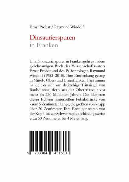 Um Dinosaurierspuren in Franken geht es in dem gleichnamigen Buch des Wissenschaftsautors Ernst Probst und des Paläontologen Raymund Windolf (1953-2010). Ihre Entdeckung gelang in Mittel-, Ober- und Unterfranken. Fast immer handelt es sich um dreizehige Trittsiegel von Raubdinosauriern aus der Obertriaszeit vor mehr als 220 Millionen Jahren. Die kleinsten dieser Echsen hinterließen Fußabdrücke von kaum 5 Zentimeter Länge, die größten von knapp über 20 Zentimeter. Ihre Erzeuger waren von der Kopf- bis zur Schwanzspitze schätzungsweise etwa 50 Zentimeter bis 4 Meter lang.
