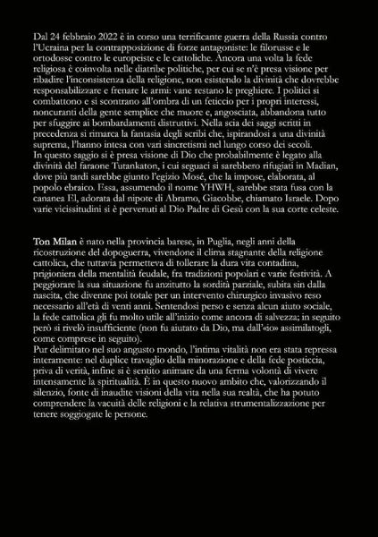 Dal 24 febbraio 2022 è in corso una terrificante guerra della Russia contro l'Ucraina per la contrapposizione di varie forze antagoniste, tra cui le filorusse con le ortodosse da una parte e le europeiste con le cattoliche dall'altra. Ancora una volta la fede è coinvolta nelle diatribe politiche, per cui se n'è preso visione per ribadire l'inconsistenza della religione, non esistendo la divinità che dovrebbe responsabilizzare e frenare l'utilizzo delle armi: vane restano le preghiere. I politici si combattono e si scontrano all'ombra di un feticcio per i propri interessi, noncurante della gente semplice che muore e, angosciata, abbandona tutto per sfuggire ai bombardamenti. Nella scia dei saggi scritti in precedenza si rimarca la fantasia degli scribi che, ispirandosi a una divinità suprema, l'hanno intesa con vari sincretismi nel lungo corso dei secoli. In questo saggio si è preso visione di Dio che probabilmente sarebbe legato alla divinità del faraone Tutankhaton, i cui seguaci si sarebbero rifugiati in Madian, dove più tardi sarebbe giunto Mosé, che la impose, elaborata, al popolo ebreo. Essa, assumendo il nome YHWH sarebbe stata fusa con la divinità cananea El, adorata dal nipote di Abramo, Giacobbe, chiamato Israele. Dopo varie vicissitudini si è pervenuti al Dio Padre di Gesù.