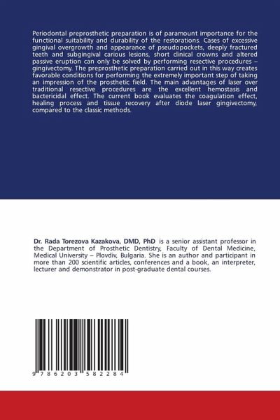 Periodontal preprosthetic preparation is of paramount importance for the functional suitability and durability of the restorations. Cases of excessive gingival overgrowth and appearance of pseudopockets, deeply fractured teeth and subgingival carious lesions, short clinical crowns and altered passive eruption can only be solved by performing resective procedures - gingivectomy. The preprosthetic preparation carried out in this way creates favorable conditions for performing the extremely important step of taking an impression of the prosthetic field. The main advantages of laser over traditional resective procedures are the excellent hemostasis and bactericidal effect. The current book evaluates the coagulation effect, healing process and tissue recovery after diode laser gingivectomy, compared to the classic methods.