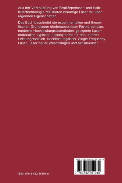 Aus der Verknüpfung von Festkörperlaser und Halbleitertechnologie resultieren neuartige Laser mit hervorragenden Eigenschaften. Das Buch beschreibt moderne Hochleistungslaserdioden, Kriterien für die Auswahl geeigneter Lasermaterialien, Designs typischer Lasersysteme (Pumpanordnung, Kristallgeometrie, Resonatoren), bis hin zur detaillierten Darstellung diodengepumpter Laser wie Hochleistungslaser, Single Frequency-Laser, Laser neuer Wellenlängen und Miniaturlaser. Abschließend werden Anwendungen und Entwicklungsmöglichkeiten diskutiert.