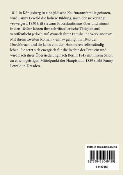 1811 in Königsberg in eine jüdische Kaufmannsfamilie geboren, wird Fanny Lewald die höhere Bildung, nach der sie verlangt, verweigert. 1830 tritt sie zum Protestantismus über und nimmt in den 1840er Jahren ihre schriftstellerische Tätigkeit auf, veröffentlicht jedoch auf Wunsch ihrer Familie ihr Werk anonym. Mit ihrem zweiten Roman "Jenny" gelingt ihr 1843 der Durchbruch und sie kann von den Honoraren selbstständig leben. Sie setzt sich energisch für die Rechte der Frau ein und wird nach ihrer Übersiedelung nach Berlin 1845 mit ihrem Salon zu einem geistigen Mittelpunkt der Hauptstadt. 1889 stirbt Fanny Lewald in Dresden.