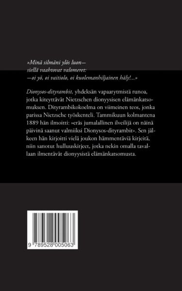 »Dionysos-dityrambit», yhdeksän vapaarytmistä runoa, jotka kiteyttävät Nietzschen dionyysisen elämänkatsomuksen. Dityrambikokoelma on viimeinen teos, jonka parissa Nietzsche työskenteli. Tammikuun kolmantena 1889 hän ilmoitti: »eräs jumalallinen ilveilijä on näinä päivinä saanut valmiiksi Dionysos-dityrambit». Sen jälkeen hän kirjoitti vielä joukon hämmentäviä kirjeitä, niin sanotut hulluuskirjeet, jotka nekin omalla tavallaan ilmentävät dionyysistä elämänkatsomusta.