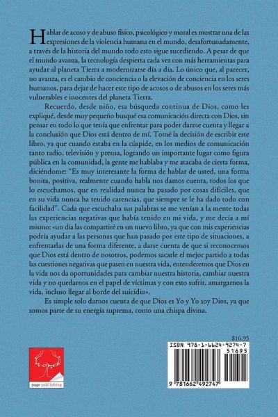 Hablar de acoso y de abuso físico, psicológico y moral es mostrar una de las expresiones de la violencia humana en el mundo, desafortunadamente, a través de la historia del mundo todo esto sigue sucediendo. A pesar de que el mundo avanza, la tecnología despierta cada vez con más herramientas para ayudar al planeta Tierra a modernizarse día a día. Lo único que, al parecer, no avanza, es el cambio de conciencia o la elevación de conciencia en los seres humanos, para dejar de hacer este tipo de acosos o de abusos en los seres más vulnerables e inocentes del planeta Tierra. Recuerdo, desde niño, esa búsqueda continua de Dios, como les expliqué, desde muy pequeño busqué esa comunicación directa con Dios, sin pensar en todo lo que tenía que enfrentar para poder darme cuenta y llegar a la conclusión que Dios está dentro de mí. Tomé la decisión de escribir este libro, ya que cuando estaba en la cúspide, en los medios de comunicación tanto radio, televisión y prensa, logrando un importante lugar como figura pública en la comunidad, la gente me hablaba y me atacaba de cierta forma, diciéndome: "Es muy interesante la forma de hablar de usted, una forma bonita, positiva, realmente cuando habla nos damos cuenta, todos los que lo escuchamos, que en realidad nunca ha pasado por cosas difíciles, que en su vida nunca ha tenido carencias, que siempre se le ha dado todo con facilidad". Cada que escuchaba sus palabras se me venían a la mente todas las experiencias negativas que había tenido en mi vida, y me decía a mí mismo: un día las compartiré en un nuevo libro, ya que con mis experiencias podría ayudar a las personas que han pasado por este tipo de situaciones, a enfrentarlas de una forma diferente, a darse cuenta de que si reconocemos que Dios está dentro de nosotros, podemos sacarle el mejor partido a todas las cuestiones negativas que pasen en nuestra vida, entenderemos que Dios en la vida nos da oportunidades para cambiar nuestra historia, cambiar nuestra vida y no quedarnos en el papel de víctimas y con esto sufrir, amargarnos la vida, incluso llegar al borde del suicidio. Es simple solo darnos cuenta de que Dios es Yo y Yo soy Dios, ya que somos parte de su energía suprema, como una chispa divina.