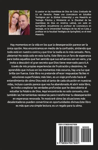 Hay momentos en la vida en los que la desesperación parece ser la única opción. Nos encontramos en medio de la confusión, sintiendo que todo está en nuestra contra y que tirar la toalla es lo más sensato. Pero, ¡detente! No estás solo en esta lucha. Este libro es un faro de esperanza para todos aquellos que han sentido que sus esfuerzos son en vano, y te invito a descubrir el gran secreto que Dios tiene reservado para ti.A través de mis propias experiencias de frustración y desánimo, he aprendido que incluso en los momentos más oscuros, hay una luz que brilla con fuerza. Este libro no pretende ofrecer respuestas fáciles ni soluciones superficiales; más bien, es un viaje profundo hacia el entendimiento de cómo Dios está al tanto de cada situación en nuestras vidas, incluso cuando parece que nos ha abandonado. Al abrir este libro, te invito a explorar las verdades profundas que he descubierto al estudiar la Palabra de Dios. Aquí encontrarás no solo consuelo, sino también las herramientas necesarias para transformar tu desesperación en esperanza renovada. Te mostraré cómo las situaciones más desalentadoras pueden convertirse en oportunidades divinas.Este libro es más que una simple lectura; es un regalo para tu alma. Es una invitación a descubrir el Secreto que puede cambiar tu vida y llevarte a experimentar la paz y la alegría que solo Dios puede ofrecer. Así que no esperes más. Permite que estas páginas te inspiren a levantarte y seguir adelante, a confiar en que cada desafío es parte del plan perfecto de Dios para ti.¡Atrévete a dar el primer paso hacia una nueva perspectiva! Este libro podría ser el inicio de una transformación radical en tu vida. La esperanza está a solo una página de distancia; ¿estás listo para descubrirla?