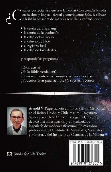 ¿Cuál es correcta: la ciencia o la Biblia? Cuidadosamente investigada y organizada, Dios, la Ciencia y la Biblia aborda de frente las preguntas difíciles que se relacionan con algunos de los aspectos más debatidos de la creación y la fe cristiana. Con ciencia basada en hechos, y lógica original y convincente, Dios, la Ciencia y la Biblia presenta, de manera sencilla, la verdad sobre: ¿ la teoría del Big Bang ¿ la teoría de la evolución ¿ la edad del universo ¿ el diluvio de Noé ¿ el registro fósil ¿ la edad de los árboles y responde las preguntas: ¿Dios existe? ¿Es la Biblia verdadera? ¿Jesús realmente vivió, murió y volvió a la vida? ¿Podemos vivir para siempre? Y si es así, ¿cómo? Las teorías ampliamente aceptadas sobre el origen del universo, el sistema solar y la fuente de vida, se examinan críticamente a la luz de las leyes de la física, la evidencia fósil y una lógica nítida, todo que demuestran que el mundo no se pudo haber formado naturalmente. El indiscutible cumplimiento de muchas profecías extraordinarias en el Antiguo Testamento demuestra que los autores bíblicos estaban genuninamente en contacto con Dios. Sobre todo, la evidencia de la resurrección de Cristo, que se evitó deliberadamente en libro El Engaño de Dios, se presenta de manera sucinta y convincente, lo que demuestra la verdad de la promesa del evangelio de que mediante la fe en Jesús nosotros también podemos ser resucitados para vivir para siempre en una planeta Tierra recreada. El autor incluye fascinantes experiencias personales que lo ayudaron, como estudiante de ingeniería que alguna vez fue escéptico, a creer en un Dios vivo que nos ha creado a cada uno de nosotros con el propósito de disfrutar de su bondad y amor para siempre. Arnold V Page es miembro profesional del británico Instituto de Ciencias de la Madera y del Instituto de Materiales, Minerales y Minería. Trabajó como pastor cristiano en Ingelaterra y Chile por 25 años, y como Ingeniero Senior dedicado a la investigación y desarrollo de madera y productos derivados de la madera para la construcción.