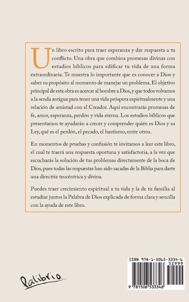 Un libro escrito para traer esperanza y dar respuesta a tu conflicto. Una obra que combina promesas divinas con estudios bíblicos para edificar tu vida de una forma extraordinaria. Te muestra lo importante que es conocer a Dios y saber su propósito al momento de manejar un problema. El objetivo principal de esta obra es acercar al hombre a Dios, y que todos volvamos a la senda antigua para tener una vida próspera espiritualmente y una relación de amistad con el Creador. Aquí encontrarás promesas de fe, amor, esperanza, perdón y vida eterna. Los estudios bíblicos que presentamos te ayudarán a crecer y comprender quién es Dios y su Ley, qué es el perdón, el pecado, el bautismo, entre otros. En momentos de pruebas y confusión te invitamos a leer este libro, el cual te traerá una respuesta oportuna y satisfactoria, a la vez que escucharás la solución de tus problemas directamente de la boca de Dios, pues todas las respuestas han sido sacadas de la Biblia para darte una directriz teocéntrica y divina. Puedes traer crecimiento espiritual a tu vida y la de tu familia al estudiar juntos la Palabra de Dios explicada de forma clara y sencilla con la ayuda de este libro.