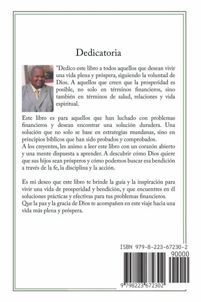 Dedicatoria "Dedico este libro a todos aquellos que desean vivir una vida plena y próspera, siguiendo la voluntad de Dios. A aquellos que creen que la prosperidad es posible, no solo en términos financieros, sino también en términos de salud, relaciones y vida espiritual. Este libro es para aquellos que han luchado con problemas financieros y desean encontrar una solución duradera. Una solución que no solo se base en estrategias mundanas, sino en principios bíblicos que han sido probados y comprobados.