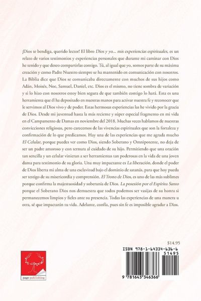 ¡Dios te bendiga, querido lector! El libro Dios y yo... mis experiencias espirituales, es un relato de varios testimonios y experiencias personales que durante mi caminar con Dios he tenido y que deseo compartirlas contigo. Tú, al igual que yo, somos parte de su máxima creación y como Padre Nuestro siempre se ha mantenido en comunicación con nosotros. La Biblia dice que Dios se comunicaba directamente con muchos de sus hijos como Adán, Moisés, Noe, Samuel, Daniel, etc. Dios es el mismo, no tiene sombra de variación y si lo hizo con nosotros estoy bien segura de que también contigo lo hará. Esta es una herramienta que él ha depositado en nuestras manos para activar nuestra fe y reconocer que le servimos al Dios vivo y de poder. Estas hermosas experiencias las he vivido por la gracia de Dios. Desde mi juventud hasta la más reciente y súper especial fragmento en mi vida en el Campamento de Damas en noviembre del 2018. Muchas veces hablamos de nuestras convicciones religiosas, pero carecemos de las vivencias espirituales que son la fortaleza y confirmación de lo que predicamos. Hay una de las experiencias que me agrada mucho El Celular, porque puedes ver como Dios, siendo Soberano y Omnipotente, no deja de ser un padre amoroso y con ternura al cuidado de su hijo. Permitiendo que una oración tan sencilla y un celular vinieran a ser herramientas tan poderosas en la vida de una joven dama para testimonio de su gloria. Una muy impactante es La liberación, donde el poder de Dios liberta mi alma de una esclavitud bajo el dominio de satanás, para que hoy pueda ser testigo de su misericordia y comprensión. El Trono de Dios, es uno de las más sublimes porque confirma la majestuosidad y soberanía de Dios. La posesión por el Espíritu Santo porque el Soberano Dios nos demuestra que todos podemos ser vasijas de su honra si permanecemos limpios y fieles ante su presencia. Todas las experiencias de una manera u otra, sé que impactarán tu vida. Adelante, confía, pues sin fe es imposible agradar a Dios.