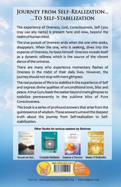 Journey from Self-realization to Self-stabilization... The experience of Oneness, God, Consciousness, Self (you may use any name) is present here and now, beyond the realm of human mind. The true pursuit of Oneness ends when the one who seeks, disappears. When the one, who is seeking, dives into the expanse of Oneness, he loses himself. Oneness reveals itself as a dynamic stillness which is the source of the vibrant dance of the universe. There are many who experience momentary flashes of Oneness in the midst of their daily lives. However, the journey should not stop with mere glimpses. The real purpose of life is to stabilize in the experience of Self and express divine qualities of unconditional love, bliss and peace. A true Guru leads the seeker beyond mere glimpses to stabilize permanently in the sublime bliss of Pure Consciousness. This pocket book is a series of profound answers that arise from the quintessence of wisdom. These answers unravel the deepest truth about the journey from Self-realization to Self-stabilization.