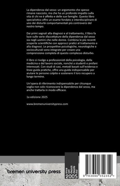 La dipendenza dal sesso: un argomento che spesso rimane nascosto, ma che ha un profondo impatto sulla vita di chi ne è affetto e delle sue famiglie. Questo libro specialistico offre un esame fondato e interdisciplinare di uno dei disturbi comportamentali più controversi del nostro tempo. Dai primi segnali alla diagnosi e al trattamento, il libro fa luce sulle varie sfaccettature della dipendenza dal sesso sia negli uomini che nelle donne. Combina le più recenti scoperte scientifiche con approcci pratici al trattamento e alla diagnosi. Le prospettive psicologiche, neurologiche e socioculturali sono integrate per creare una comprensione completa di questo complesso disturbo. Il libro si rivolge a professionisti della psicologia, della medicina e del lavoro sociale, nonché a studenti e profani interessati. Con studi di casi, metodi basati sull'evidenza e linee guida pratiche, offre una guida indispensabile per aiutare le persone colpite e sostenere il loro recupero a lungo termine. Un'opera di riferimento indispensabile per chiunque voglia non solo riconoscere la dipendenza dal sesso, ma anche trattarla in modo efficace.