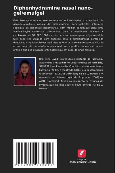 Este livro apresenta o desenvolvimento de formulações e a avaliação de nano-gel/emulgéis nasais de difenidramina, com gotículas interiores lipofílicas de dimensão nanométrica, com melhor penetração para uma administração controlada direcionada para a membrana mucosa. A combinação de PG, PEG-1000 e azeite de oliva no nano-gel/emulgel nasal de DPH pode ser utilizada com sucesso para a administração controlada direcionada. As formulações optimizadas têm uma excelente permeabilidade e um tempo de permanência prolongado na superfície da mucosa, o que prova a sua boa atividade anti-histamínica em caso de rinite alérgica.