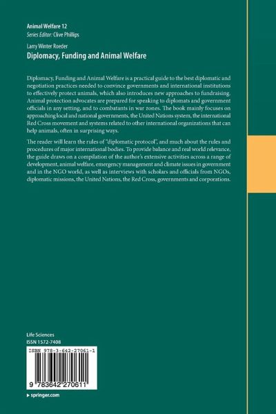 Diplomacy, Funding and Animal Welfare is a practical guide to the best diplomatic and negotiation practices needed to convince governments and international institutions to effectively protect animals, which also introduces new approaches to fundraising. Animal protection advocates are prepared for speaking to diplomats and government officials in any setting, and to combatants in war zones. The book mainly focuses on approaching local and national governments, the United Nations system, the international Red Cross movement and systems related to other international organizations that can help animals, often in surprising ways.