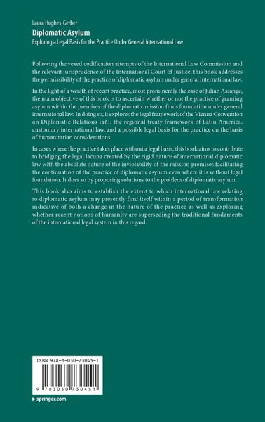 In cases where the practice takes place without a legal basis, this book aims to contribute to bridging the legal lacuna created by the rigid nature of international diplomaticlaw with the absolute nature of the inviolability of the mission premises facilitating the continuation of the practice of diplomatic asylum even where it is without legal foundation. It does so by proposing solutions to the problem of diplomatic asylum.