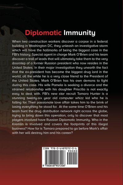 When two construction workers discover a corpse in a federal building in Washington DC, they unleash an investigative storm which will have all the hallmarks of being the biggest case in the FBI's history. Special agent in charge Mark O'Brien and his team discover a trail of leads that will ultimately take them to the very doorstep of a former Russian president who now resides in the United States. In their major investigation they unearth the fact that the ex-president has become the biggest drug lord in the world, all the while he is a very close friend to the President of the United States. Mark O'Brien has his own demons to fight during this case. His wife Pamela is seeking a divorce and the strained relationship with his daughter Priscilla is not exactly easy to deal with. FBI's new star recruit Tamara Hunter is a stunning twenty-six year old computer whizz kid who he is falling for. Their passionate love affair takes him to the brink of losing everything he stood for. At the same time O'Brien and his team hunt the drug distribution network right across the globe, trying to bring down this operation, only to discover that most players involved have Russian Diplomatic Immunity. Who in the Kremlin is involved and covers the footprints of this illegal business? How far is Tamara prepared to go before Mark's affair with her will destroy him and his career?