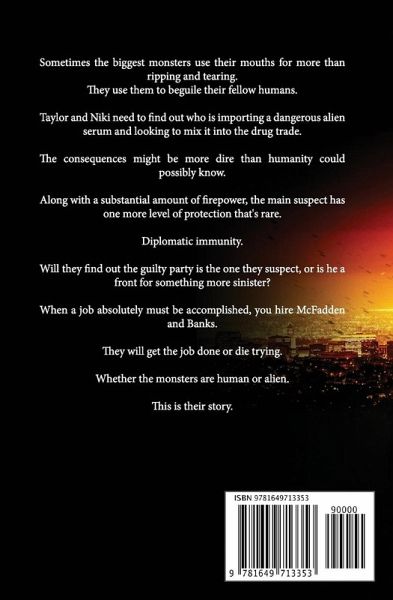 Sometimes the biggest monsters use their mouths for more than ripping and tearing. They use them to beguile their fellow humans. Taylor and Niki need to find out who is importing a dangerous alien serum and looking to mix it into the drug trade. The consequences might be more dire than humanity could possibly know. Along with a substantial amount of firepower, the main suspect has one more level of protection that's rare. Diplomatic immunity. Will they find out the guilty party is the one they suspect, or is he a front for something more sinister? When a job absolutely must be accomplished, you hire McFadden and Banks. They will get the job done or die trying. Whether the monsters are human or alien. This is their story. Go up and click 'Read for Free' or 'Buy Now' to find out what goes on with two psychotic individuals, overwhelming firepower, and serious attitude problems. "Sometimes, crazy is what you need to save humanity." - Michael Anderle