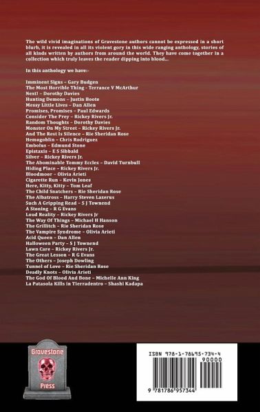 The wild vivid imaginations of Gravestone authors cannot be expressed in a short blurb, it is revealed in all its violent gory in this wide ranging anthology, stories of all kinds written by authors from around the world. They have come together in a collection which truly leaves the reader dipping into blood... In this anthology we have: - Imminent Signs - Gary Budgen The Most Horrible Thing - Terrance V McArthur Next! - Dorothy Davies Hunting Demons - Justin Boote Messy Little Lives - Dan Allen Promises, Promises - Paul Edwards Consider The Prey - Rickey Rivers Jr. Random Thoughts - Dorothy Davies Monster On My Street - Rickey Rivers Jr. And The Rest Is Silence - Rie Sheridan Rose Hemogoblin - Chris Rodriguez Embolus - Edmund Stone Epistaxis - E S Sibbald Silver - Rickey Rivers Jr. The Abominable Tommy Eccles - David Turnbull Hiding Place - Rickey Rivers Jr. Bloodmoor - Olivia Arieti Cigarette Run - Kevin Jones Here, Kitty, Kitty - Tom Leaf The Child Snatchers - Rie Sheridan Rose The Albatross - Harry Steven Lazerus Such A Gripping Read - S J Townend A Stoning - R G Evans Loud Reality - Rickey Rivers Jr The Way Of Things - Michael H Hanson The Grillitch - Rie Sheridan Rose The Vampire Syndrome - Olivia Arieti Acid Queen - Dan Allen Halloween Party - S J Townend Lawn Care - Rickey Rivers Jr. The Great Lesson - R G Evans The Others - Joseph Dowling Tunnel of Love - Rie Sheridan Rose Deadly Knots - Olivia Arieti The God Of Blood And Bone - Michelle Ann King La Patasola Kills in Tierradentro - Shashi Kadapa