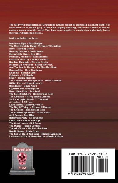 The wild vivid imaginations of Gravestone authors cannot be expressed in a short blurb, it is revealed in all its violent gory in this wide ranging anthology, stories of all kinds written by authors from around the world. They have come together in a collection which truly leaves the reader dipping into blood... In this anthology we have: - Imminent Signs - Gary Budgen The Most Horrible Thing - Terrance V McArthur Next! - Dorothy Davies Hunting Demons - Justin Boote Messy Little Lives - Dan Allen Promises, Promises - Paul Edwards Consider The Prey - Rickey Rivers Jr. Random Thoughts - Dorothy Davies Monster On My Street - Rickey Rivers Jr. And The Rest Is Silence - Rie Sheridan Rose Hemogoblin - Chris Rodriguez Embolus - Edmund Stone Epistaxis - E S Sibbald Silver - Rickey Rivers Jr. The Abominable Tommy Eccles - David Turnbull Hiding Place - Rickey Rivers Jr. Bloodmoor - Olivia Arieti Cigarette Run - Kevin Jones Here, Kitty, Kitty - Tom Leaf The Child Snatchers - Rie Sheridan Rose The Albatross - Harry Steven Lazerus Such A Gripping Read - S J Townend A Stoning - R G Evans Loud Reality - Rickey Rivers Jr The Way Of Things - Michael H Hanson The Grillitch - Rie Sheridan Rose The Vampire Syndrome - Olivia Arieti Acid Queen - Dan Allen Halloween Party - S J Townend Lawn Care - Rickey Rivers Jr. The Great Lesson - R G Evans The Others - Joseph Dowling Tunnel of Love - Rie Sheridan Rose Deadly Knots - Olivia Arieti The God Of Blood And Bone - Michelle Ann King La Patasola Kills in Tierradentro - Shashi Kadapa