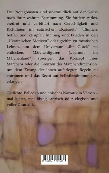 Die Protagonisten sind unermüdlich auf der Suche nach ihrer wahren Bestimmung. Sie fordern ratlos, erzürnt und verbittert nach Gerechtigkeit und Richtlinien im satirischen "Kabarett", träumen, hoffen und kämpfen für Sieg und Frieden in den "Ukrainischen Motiven" oder greifen zu mystischen Lehren, um dem Universum "ihr Glück" zu entlocken. Märchenfiguren ("Tumult im Märchenland") sprengen das Konzept ihres Märchens oder die Grenzen der Märchendimension, um dem Zwang der ihnen auferlegten Regeln zu entrinnen und das Recht auf Selbstbestimmung zu erlangen.Gedichte, Balladen und episches Narrativ in Versen - mal heiter, mal bissig satirisch oder elegisch und voller Dramatik.