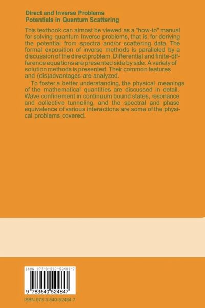 Dieses Buch ist fast ein "Rezeptbuch" für die Lösung des quantenmechanischen inversen Problems, d.h. für die Ermittlung des Potentials aus Spektren oder Streudaten, sowie eine Art "Bilderbuch" der Quantenmechanik, welches das Gefühl des Lesers für die Quantenmechanik verbessern soll. Die formale Darstellung der inversen Methoden erfolgt parallel zu der des direkten Problems. Differential- und Differenzengleichungen werden Seite an Seite entwickelt. Eine Vielfalt von Lösungsmethoden wird präsentiert. Zur Vertiefung des Verständnisses werden die physikalischen Bedeutungen der mathematischen Größen im Detail diskutiert.