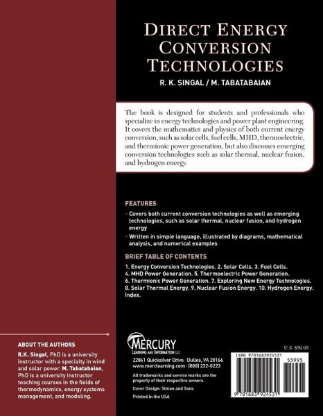 Written in clear language, illustrated by diagrams, mathematical analysis, and numerical examplesm this book covers the mathematics and physics of both current conversion--solar cells, fuel cells, MHD, thermoelectric, and thermionic power generation--and discusses emerging conversion technologies such as solar thermal, nuclear fusion, and hydrogen energy.