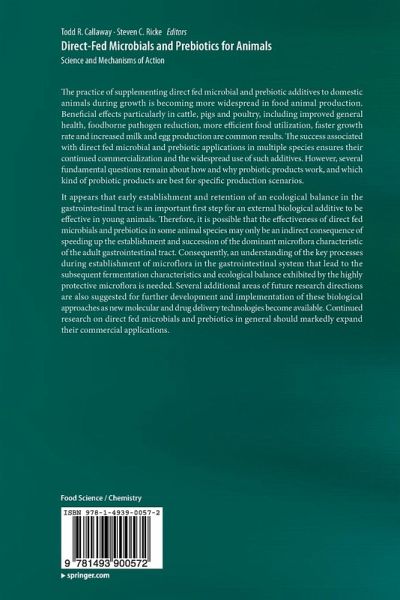 I. Overview of Direct-Fed Microbials and Prebiotics and Their Interactions with the Host.- 1. The Commensal Microbiota.- 2. Prebiotics of Plant and Microbial Origin.- 3. Microbial Species Characteristics and Selection.- 4. Genomics of Probiotic-Host Interactions.- 5. The Effects of Pre- and Probiotics on the Host Immune Response.- II. Current and Future Status of Practical Applications and Challenges.- 6. Current Status of Practical Applications: Pets.- 7. Current Perspectives on Probiotics in Poultry Preharvest Food Safety.- 8. Current Status of Practical Applications: Probiotics in Dairy Cattle.- 9. Current Future Status of Practical Applications: Beef Cattle.- 10. Future Challenges of Administration of Direct-Fed Microbial Supplementation to Swine.- 11. Characteristics and Modification of the Intestinal Tract Microbiota of Channel Catfish Ictalurus punctatus .- 12. The Use of Direct-Fed Microbials as a Pre-Harvest Food Safety Intervention in Cattle.