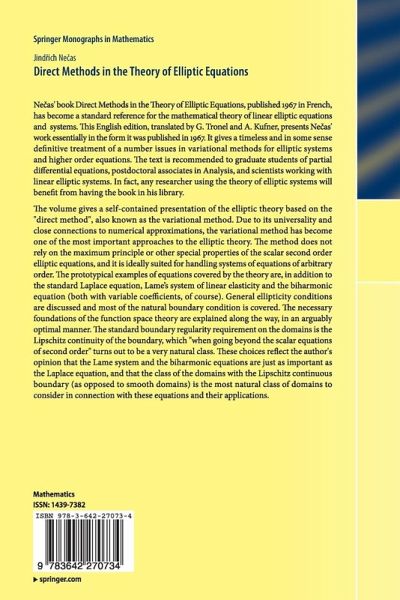 Necas' book Direct Methods in the Theory of Elliptic Equations, published 1967 in French, has become a standard reference for the mathematical theory of linear elliptic equations and systems. This English edition, translated by G. Tronel and A. Kufner, presents Necas' work essentially in the form it was published in 1967. It gives a timeless and in some sense definitive treatment of a number issues in variational methods for elliptic systems and higher order equations. The text is recommended to graduate students of partial differential equations, postdoctoral associates in Analysis, and scientists working with linear elliptic systems. In fact, any researcher using the theory of elliptic systems will benefit from having the book in his library.