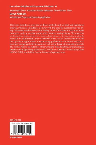 This book provides an overview of direct methods such as limit and shakedown analysis, which are intended to do away with the need for cumbersome step-by-step calculations and determine the loading limits of mechanical structures under monotone, cyclic or variable loading with unknown loading history. The respective contributions demonstrate how tremendous advances in numerical methods, especially in optimization, have contributed to the success of direct methods and their practical applicability to engineering problems in structural mechanics, pavement and general soil mechanics, as well as the design of composite materials. The content reflects the outcomes of the workshop "Direct Methods: Methodological Progress and Engineering Applications," which was offered as a mini-symposium of PCM-CMM 2019, held in Cracow, Poland in September 2019.