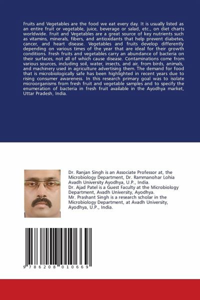 Fruits and Vegetables are the food we eat every day. It is usually listed as an entire fruit or vegetable, juice, beverage or salad, etc., on diet charts worldwide. Fruit and Vegetables are a great source of key nutrients such as vitamins, minerals, fibers, and antioxidants that help prevent diabetes, cancer, and heart disease. Vegetables and fruits develop differently depending on various times of the year that are ideal for their growth conditions. Fresh fruits and vegetables carry an abundance of bacteria on their surfaces, not all of which cause disease. Contaminations come from various sources, including soil, water, insects, and air, from birds, animals, and machinery used in agriculture advertising them. The demand for food that is microbiologically safe has been highlighted in recent years due to rising consumer awareness. In this research primary goal was to isolate microorganisms from fresh fruit and vegetable samples and to specify the enumeration of bacteria in fresh fruit available in the Ayodhya market, Uttar Pradesh, India.