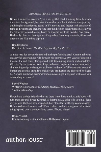 ADVANCE PRAISE FOR DIRECTED BY Bruce Kimmel's Directed by is a delightful read. Coming from his rich theatrical background, he takes the reader on a behind the scenes journey outlining his experiences acting in TV, movies, and theater with an array of famous directors and then moving into the director's chair himself. He gives the reader advice on directing based on specific incidents from his own career. His keenly observed descriptions of legendary Broadway musicals, films, and directors are like a time capsule. -Randal Kleiser, Director of Grease, The Blue Lagoon, and Big Top Pee Wee A must-read for anyone interested in the performing arts! Kimmel takes us on a joyful, entertaining ride through his impressive 60+ years of directing theatre, TV and films. Jam-packed with fascinating stories and anecdotes, Directed by is a treasure trove of tips on how to inspire actors and crew, solve challenging script and staging problems, and most of all maintain a sense of humor and positive attitude to make every production the absolute best it can be. As with his shows, Kimmel's book moves right along and will leave you demanding an encore! -David Wechter, Writer/Director Disney's Midnight Madness, The Faculty, and Malibu Bikini Shop If you have snobby friends who say there is no theatre in LA, this book will turn them around. Bruce Kimmel IS theatre in LA as he tells you in a "lean in, you won't believe how we pulled it off" tone that will keep you fascinated. He's also directed movies and TV and cabaret and recordings and all sorts of things spread over a decades-long career. Places, please! -Bruce Vilanch, Emmy-winning writer and blonde Hollywood Square Bruce Kimmel began directing at the ripe old age of fifteen. Directed by is his account of his sixty years directing plays, musicals, TV, movies, and more. He covers all of it-how he found what worked for him, mistakes he made along the way, tips on how to deal with actors and other creatives, how to deal with problems that arise that must be solved quickly, and how to keep the work atmosphere as positive as possible. He also talks about the film and theater directors who influenced him and the directors he worked with as an actor. There are anecdotes aplenty about his hit cult film, The First Nudie Musical, and his second film, The Creature Wasn't Nice, and its difficulties in post-production. Asked to replace a director on a film called Prime Suspect on a day's notice, he goes into detail about dealing with an unhappy star whose boyfriend was the director he replaced, how he got the crew instantly on his side, how he was able to at least make a few sequences that he was proud of, while learning that no matter how professional you are and how creative you are, you cannot overcome an incoherent script. Kimmel also talks about the trend-setting cabaret shows he's done, the nightclub acts he's directed, working with kid performers, and his oddest assignment, directing a Hanna-Barbera rap video for kids. He doesn't shy away from talking about people who were difficult, but mostly he's lavish in his praise of those he's worked with. He also talks about his two successful web series, how it was to direct his bucket-list production of the musical Li'l Abner, as well as the world premiere of the Sherman Brothers musical, Levi!, the story of Levi Strauss. The book is filled with humor and the occasional sense of the absurd, Kimmel's sometimes peculiar ways of working, and mostly the extreme pleasure he takes in the work. All that and you'll learn the meaning of JEF. So, buckle up for this sometimes wild ride through a multi-faceted directing career.