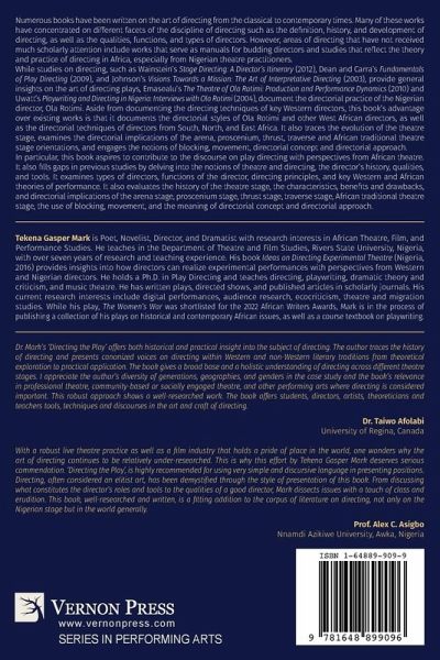 Numerous books have been written on the art of directing from the classical to contemporary times. Many of these works have concentrated on different facets of the discipline of directing such as the definition, history, and development of directing, as well as the qualities, functions, and types of directors. However, areas of directing that have not received much scholarly attention include works that serve as manuals for budding directors and studies that reflect the theory and practice of directing in Africa, especially from Nigerian theatre practitioners. While studies on directing, such as Wainstein's 'Stage Directing: A Director's Itinerary' (2012), Dean and Carra's 'Fundamentals of Play Directing' (2009), and Johnson's 'Visions Towards a Mission: The Art of Interpretative Directing' (2003), provide general insights on the art of directing plays, Emasealu's 'The Theatre of Ola Rotimi: Production and Performance Dynamics' (2010) and Uwatt's 'Playwriting and Directing in Nigeria: Interviews with Ola Rotimi' (2004), document the directorial practice of the Nigerian director, Ola Rotimi. Aside from documenting the directing techniques of key Western directors, this book's advantage over existing works is that it documents the directorial styles of Ola Rotimi and other West African directors, as well as the directorial techniques of directors from South, North, and East Africa. It also traces the evolution of the theatre stage, examines the directorial implications of the arena, proscenium, thrust, traverse and African traditional theatre stage orientations, and engages the notions of blocking, movement, directorial concept and directorial approach. In particular, this book aspires to contribute to the discourse on play directing with perspectives from African theatre. It also fills gaps in previous studies by delving into the notions of theatre and directing, the director's history, qualities, and tools. It examines types of directors, functions of the director, directing principles, and key Western and African theories of performance. It also evaluates the history of the theatre stage, the characteristics, benefits and drawbacks, and directorial implications of the arena stage, proscenium stage, thrust stage, traverse stage, African traditional theatre stage, the use of blocking, movement, and the meaning of directorial concept and directorial approach.