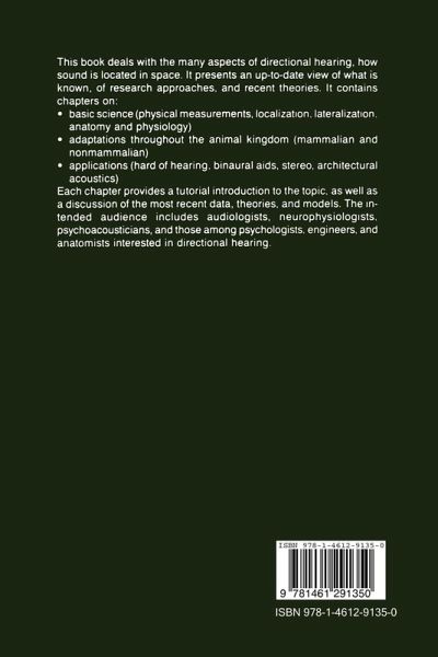 Some of the most creative scientists investigating directional hearing have contributed to this volume, providing a current and comprehensive overview of their work, their research problems, and the strategies they have used to solve them. They discuss many aspects of directional hearing from neuropsychological mechanisms underlying sound localization, through the variety of ways animals locate sound in space, to normal and pathological directional hearing in humans. This is a valuable source book for hearing scientists and clinicians, as well as for scientists without specialized background in spatial hearing, including psychologists, engineers, and biologists.
