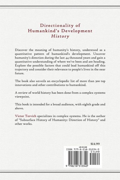 Discover the meaning of humanity's history, understood as a quantitative pattern of humankind's development. Uncover humanity's direction during the last 44 thousand years and gain a quantitative understanding of where we've been and are heading. Explore the possible factors that could lead humankind off this trajectory and consider their relevance to people's lives in the near future. The book also unveils an encyclopedic list of more than 300 top innovations and other contributions to humankind. A review of world history has been done from a complex systems viewpoint. This book is intended for a broad audience, with eighth grade and above. Victor Torvich specializes in complex systems. He is the author of "Subsurface History of Humankind: Direction of History" and other works.