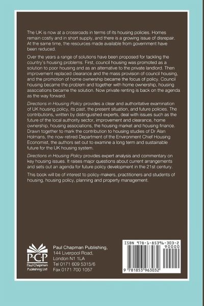 The United Kingdom is now at a crossroads in terms of its housing policies. Homes remain costly and in short supply, and there is a growing issue of disrepair. At the same time, the resources made available from government have been reduced. Directions in Housing Policy provides a clear and authoritative examination of housing policy, its past, the present situation and future policies. The authors provide expert analysis and commentary on key housing issues and set out an agenda for future policy in the 21st century.