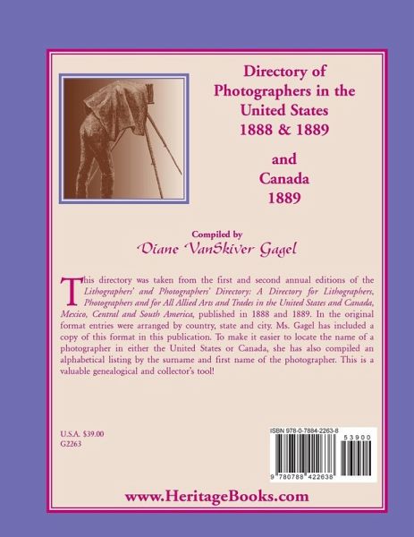 This Directory was taken from the First and Second Annual Editions of the Lithographers' and Photographers' Directory: A Directory for Lithographers, Photographers and for all allied Arts and Trades in the United States and Canada, Mexico, Central and South America, published in 1888 and 1889. In the original format entries were arranged by country, state and city. Ms. Gagel has included a copy of this format in this publication. To make it easier to locate the name of a photographer in either the United States or Canada, she has also compiled an alphabetical listing by the surname and first name of the photographer. This is a valuable genealogical and collector's tool!