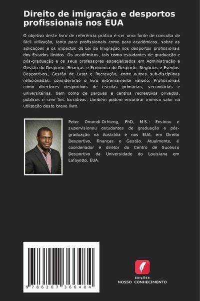 O objetivo deste livro de referência prático é ser uma fonte de consulta de fácil utilização, tanto para profissionais como para académicos, sobre as aplicações e os impactos da Lei da Imigração nos desportos profissionais dos Estados Unidos. Os académicos, tais como estudantes de graduação e pós-graduação e os seus professores especializados em Administração e Gestão do Desporto, Finanças e Economia do Desporto, Negócios e Eventos Desportivos, Gestão de Lazer e Recreação, entre outras sub-disciplinas relacionadas, considerarão o livro extremamente valioso. Profissionais como directores desportivos de escolas primárias, secundárias e universitárias, bem como de parques e centros recreativos privados, públicos e sem fins lucrativos, também podem encontrar imenso valor na utilização deste breve livro.
