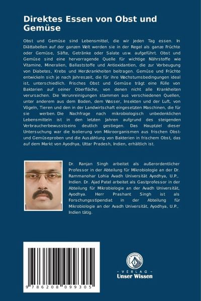Obst und Gemüse sind Lebensmittel, die wir jeden Tag essen. In Diättabellen auf der ganzen Welt werden sie in der Regel als ganze Früchte oder Gemüse, Säfte, Getränke oder Salate usw. aufgeführt. Obst und Gemüse sind eine hervorragende Quelle für wichtige Nährstoffe wie Vitamine, Mineralien, Ballaststoffe und Antioxidantien, die zur Vorbeugung von Diabetes, Krebs und Herzkrankheiten beitragen. Gemüse und Früchte entwickeln sich je nach Jahreszeit, die für ihre Wachstumsbedingungen ideal ist, unterschiedlich. Frisches Obst und Gemüse trägt eine Fülle von Bakterien auf seiner Oberfläche, von denen nicht alle Krankheiten verursachen. Die Verunreinigungen stammen aus verschiedenen Quellen, unter anderem aus dem Boden, dem Wasser, Insekten und der Luft, von Vögeln, Tieren und den in der Landwirtschaft eingesetzten Maschinen, die für sie werben. Die Nachfrage nach mikrobiologisch unbedenklichen Lebensmitteln ist in den letzten Jahren aufgrund des steigenden Verbraucherbewusstseins deutlich gestiegen. Das Hauptziel dieser Untersuchung war die Isolierung von Mikroorganismen aus frischen Obst- und Gemüseproben und die Auszählung von Bakterien in frischem Obst, das auf dem Markt von Ayodhya, Uttar Pradesh, Indien, erhältlich ist.
