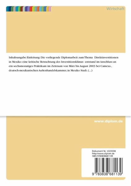 Die vorliegende Diplomarbeit zum Thema Direktinvestitionen in Mexiko: eine kritische Betrachtung des Investitionsklimas entstand im Anschluss an ein sechsmonatiges Praktikum im Zeitraum von März bis August 2003 bei Camexa., deutsch-mexikanischen Außenhandelskammer, in Mexiko Stadt.