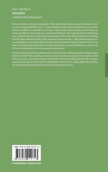 "Uta Merzbach's mathematical biography of Dirichlet is a thoroughly researched volume that describes in detail the life, labors, and legacy of this remarkable mathematician, with full details of his family, friends, and colleagues, as well as descriptions of the general mathematical scene and of the various cities in which he lived. It also contains extensive and accessible summaries of his mathematical writings." (Robin Wilson, The Mathematical Intelligencer, Vol. 42 (4), 2020)